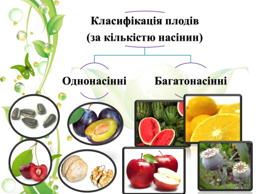Плоди за кількістю насінин: однонасінні (горіх, крилатка, сім’янка, кістянка) та багатонасінні (коробочка, стручок, ягода, померанець, яблуко, гарбузина, кістя …